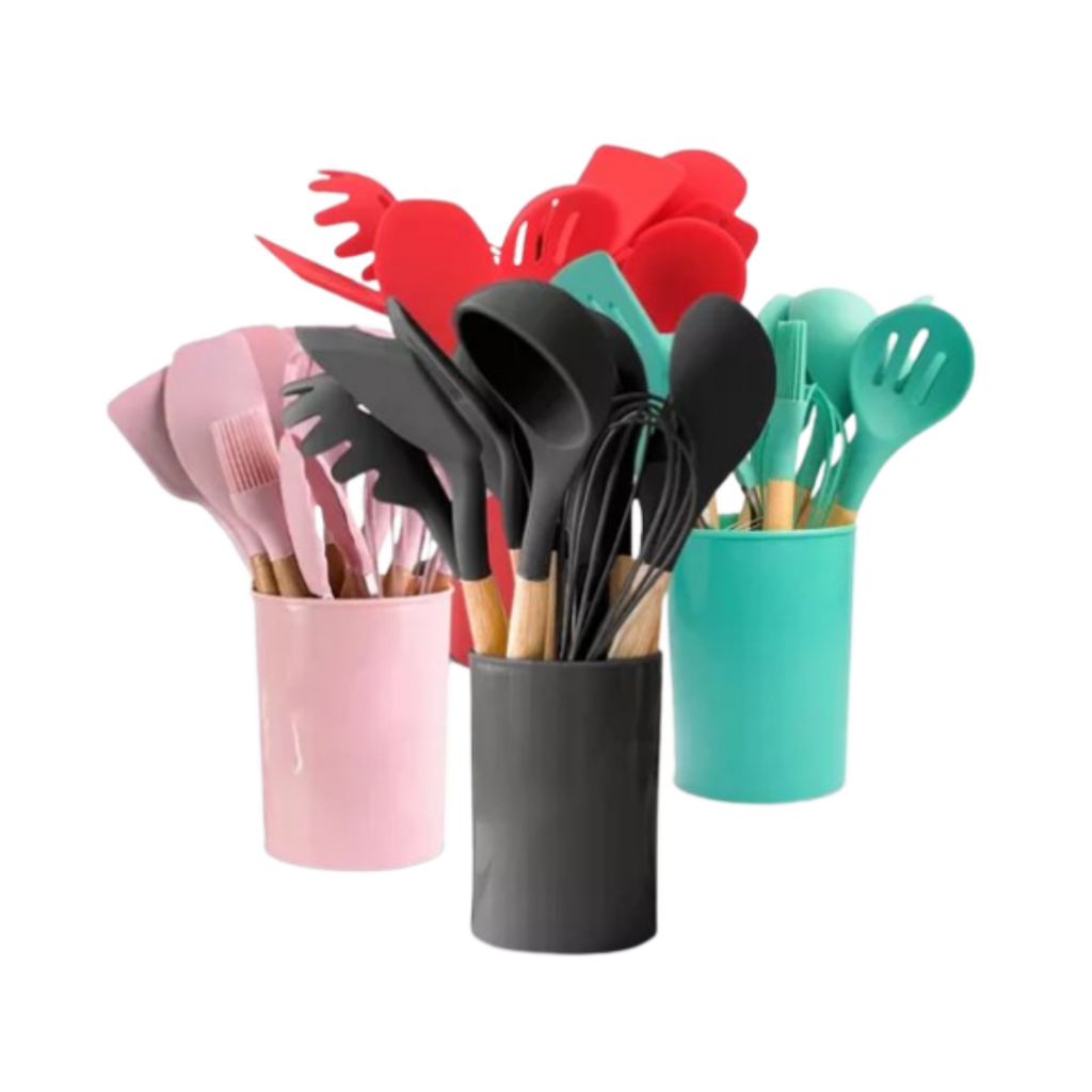 Kit 12 Utensílios De Cozinha Em Silicone E Cabo De Madeira